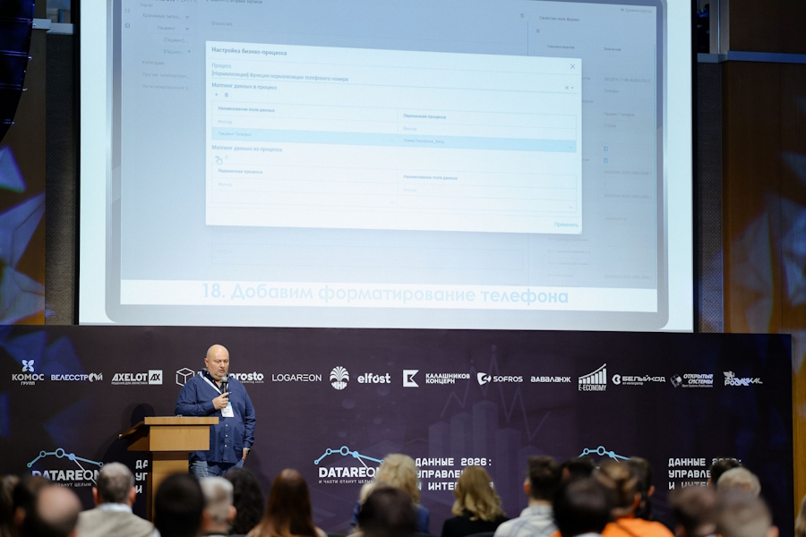 - Станислав Пиголкин, технический директор DATAREON, представил основные концепции и механизмы платформы DATAREON. Значительное внимание было уделено инструментам для управления мастер-данными и повышения качества информации предприятия. Станислав рассказал об итогах развития решения в 2025-2026 годах: завершающем этапе получения сертификата ФСТЭК, новых инструментах обеспечения безопасности и других значимых обновлениях платформы DATAREON. Также он рассказал о том, какие интересные и полезные изменения ждут пользователей в ближайший год.