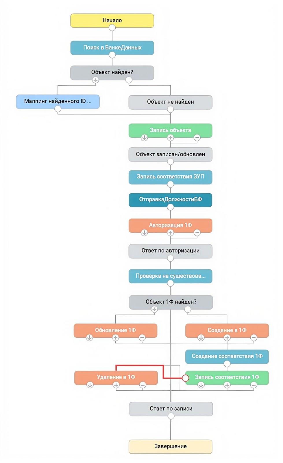 Технически решение реализовано через стандартный функционал платформы DATAREON: типы данных, обработчики и схемы с блоком «алгоритм». В рамках схемы предусмотрена логика поиска и записи соответствий в банк данных. Для обмена использовалась база MS SQL.